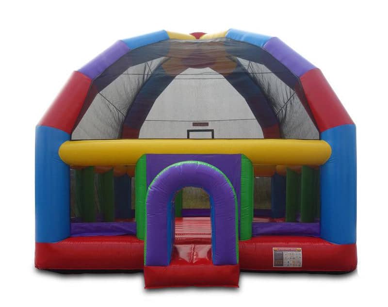 The Jumbo Dome is our largest bounce arena with a 20 ft x 20 ft Bounce Area and an 18-foot high peak. It features a basketball hoop on the back wall and is great for all ages and genders.
